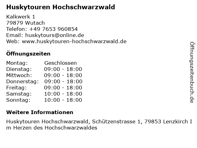 | Öffnungszeiten Huskytouren Hochschwarzwald in Wutach anzeigen | |
