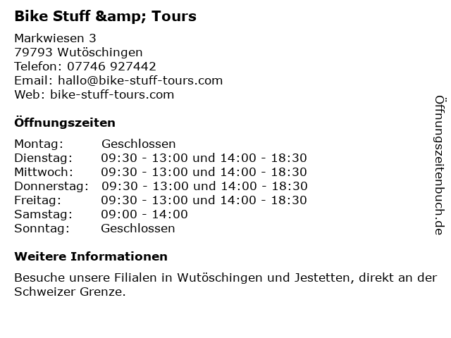 | Öffnungszeiten Bike Stuff & Tours in Wutöschingen anzeigen | |