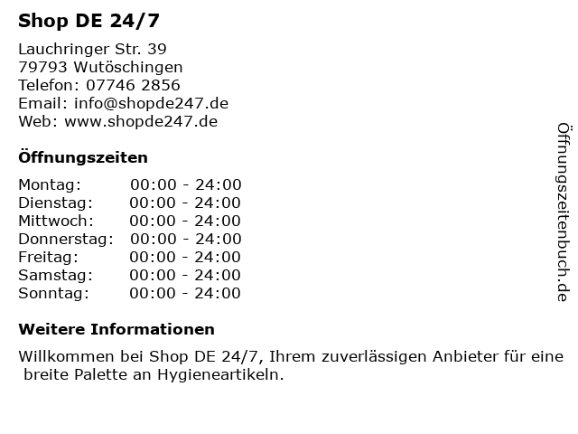 | Öffnungszeiten Shop DE 24/7 in Wutöschingen anzeigen | |