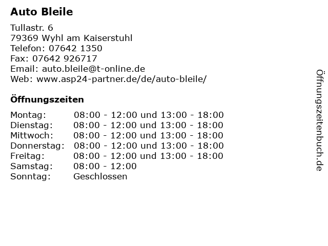 | Öffnungszeiten Auto Bleile in Wyhl am Kaiserstuhl anzeigen | |