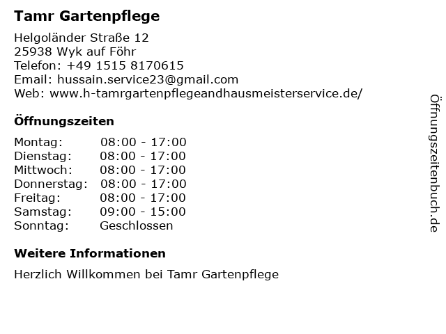 | Öffnungszeiten Tamr Gartenpflege in Wyk auf Föhr anzeigen | |