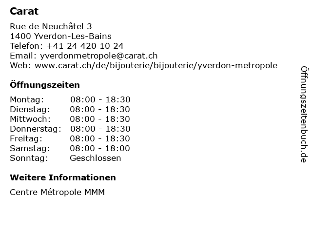 | Öffnungszeiten Carat in Yverdon-Les-Bains anzeigen | |