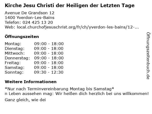 1 Neuapostolische Kirche - Communauté Yverdon-les-Bains (Entfernung: 1,67 km) Chemin de Chalamont 12, 1400 Yverdon-les-Bains 2 ASLOCA Association Suisse des Locataires (Entfernung: 1,27 km) avenue des Sports 28, 1400 Yverdon-les-Bains 4 Kirche Jesu Christi der Heiligen der Letzten Tage (Entfernung: 27,15 km) Chemin Des Roches 16, 1010 Lausanne 5 Kirche Jesu Christi der Heiligen der Letzten Tage (Entfernung: 27,39 km) Route De Marcolet 21, 1023 Crissier 6 Kirche Jesu Christi der Heiligen der Letzten Tage (Entfernung: 29,81 km) Rue Du Chasselas 3, 2034 Peseux |