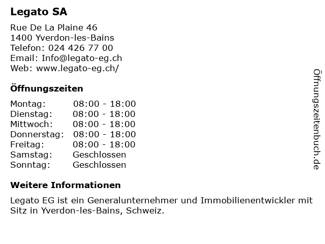 | Öffnungszeiten Legato SA in Yverdon-les-Bains anzeigen | |