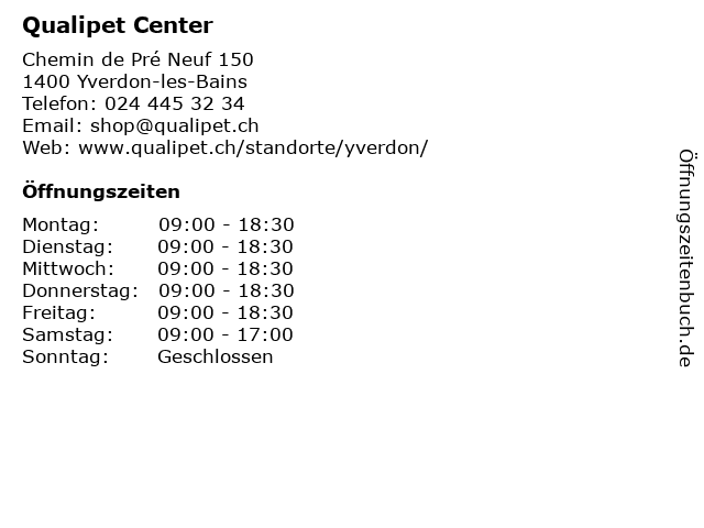 | Öffnungszeiten Qualipet Center in Yverdon-les-Bains anzeigen | |