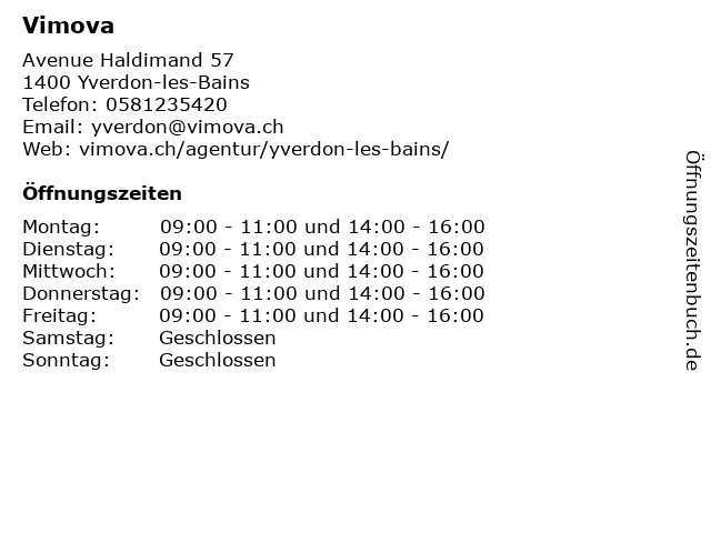 | Öffnungszeiten Vimova in Yverdon-les-Bains anzeigen | |