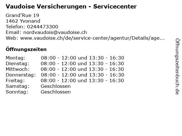4 BCV Banque Cantonale Vaudoise (Finanzberatung / Conseils financiers & Fonds / Caisse ) (Entfernung: 7,58 km) Place du Château 8, 1422 Grandson 5 BVC, Banque Cantonale Vaudoise (Geldautomat / ATM / Bancomat) (Entfernung: 7,58 km) Place du Château 8, 1422 Grandson 6 Vaudoise Versicherungen - Vaudoise Assurances (Entfernung: 9,56 km) Montagny-Chamard ,, 1401 Yverdon-les-Bains |