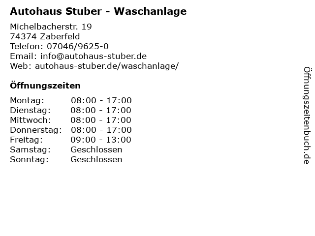 2 Autohaus Stuber GmbH - Service & Werkstatt (Entfernung: 0,01 km) Michelbacher Straße 19, 74374 Zaberfeld 5 Autohaus Bechtel GmbH & Co. KG - SB-Waschanlage (Entfernung: 11,77 km) Frankenbacher Straße 6, 74336 Brackenheim 6 |