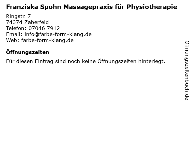 | Franziska Spohn Massagepraxis für Physiotherapie anrufen | |