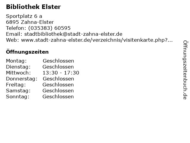| Öffnungszeiten Bibliothek Elster in Zahna-Elster anzeigen | |