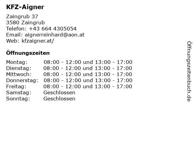 | Öffnungszeiten KFZ-Aigner in Zaingrub anzeigen | |