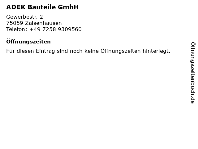 | Öffnungszeiten ADEK Bauteile GmbH in Zaisenhausen anzeigen | |