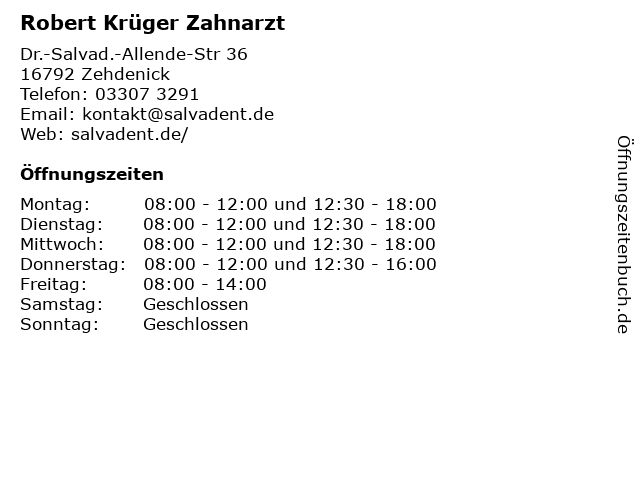 | Öffnungszeiten Robert Krüger Zahnarzt in Zehdenick anzeigen | |