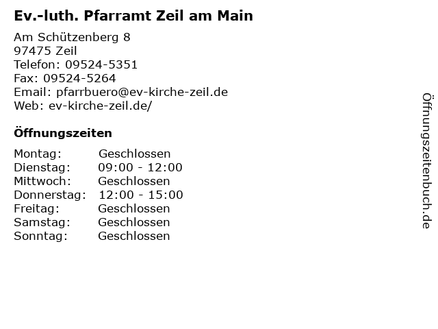 | Öffnungszeiten Ev.-luth. Pfarramt Zeil am Main in Zeil anzeigen | |