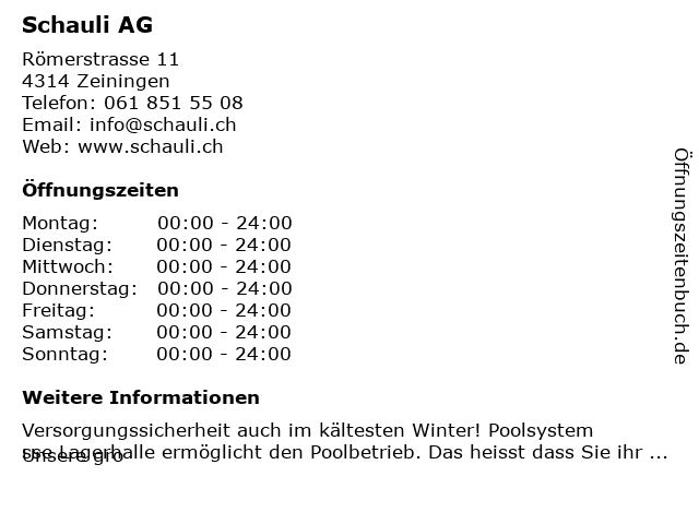 | Öffnungszeiten Schauli AG in Zeiningen anzeigen | |