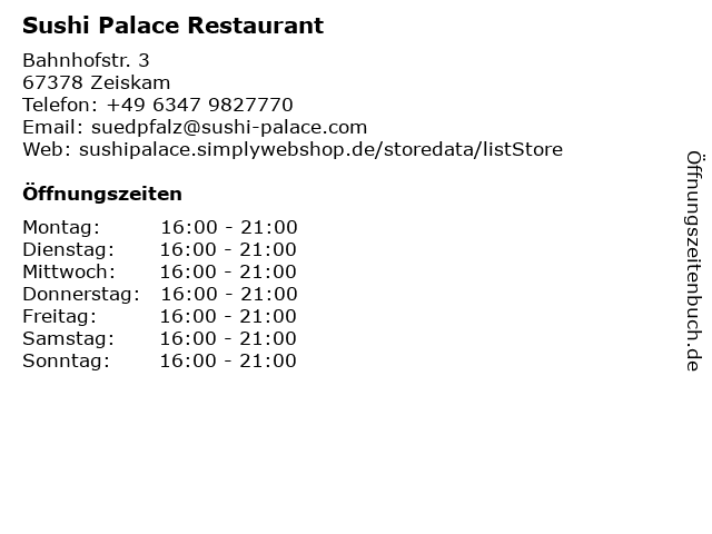 | Öffnungszeiten Sushi Palace Restaurant in Zeiskam anzeigen | |