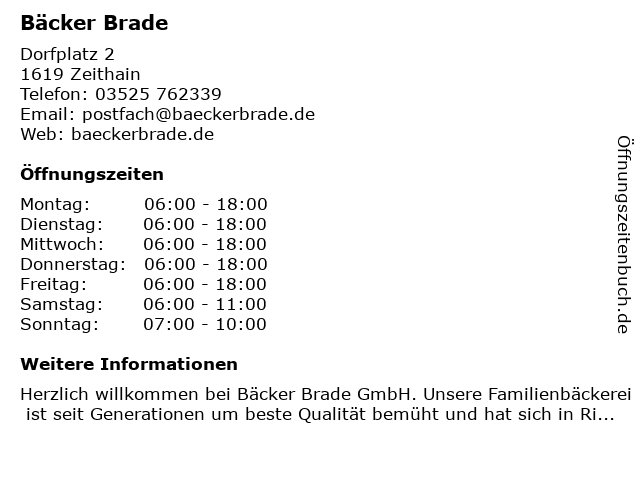 | Öffnungszeiten Bäcker Brade in Zeithain anzeigen | |