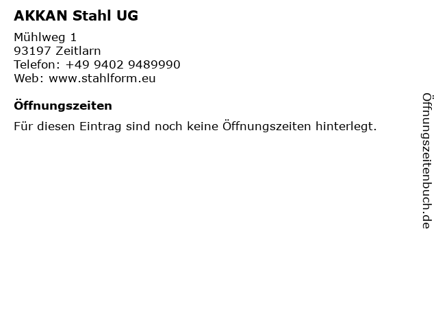 | Telefonnummer AKKAN Stahl UG in Zeitlarn (+49 9402 9489990) anrufen | |