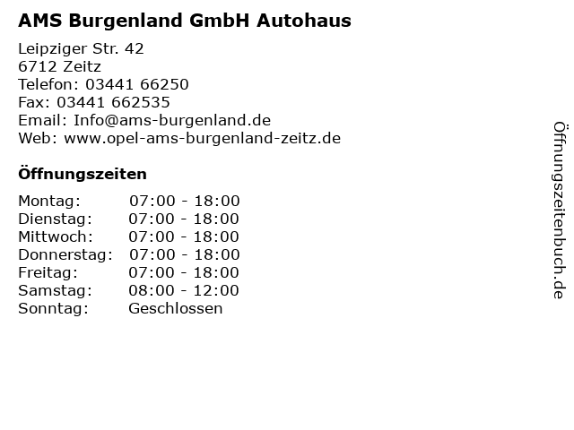 | Öffnungszeiten AMS Burgenland GmbH Autohaus in Zeitz anzeigen | |