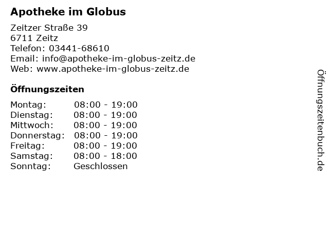| Öffnungszeiten Apotheke im Globus in Zeitz anzeigen | |