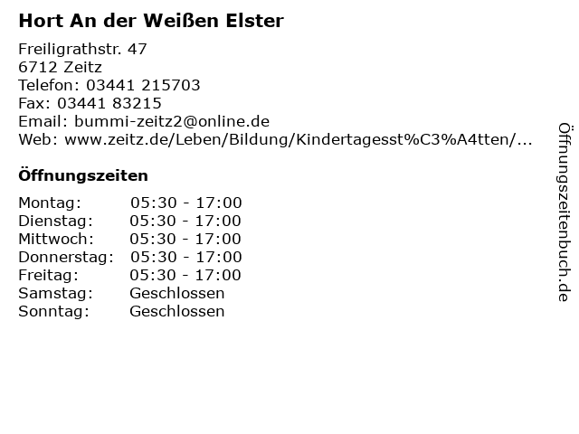 | Öffnungszeiten Hort An der Weißen Elster in Zeitz anzeigen | |