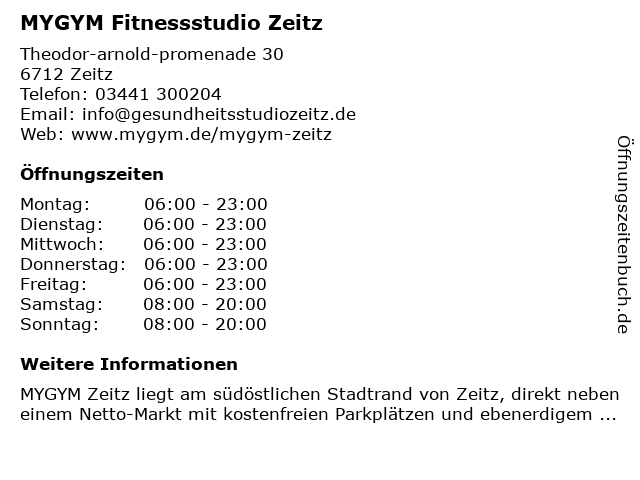 | Öffnungszeiten MYGYM Fitnessstudio Zeitz in Zeitz anzeigen | |