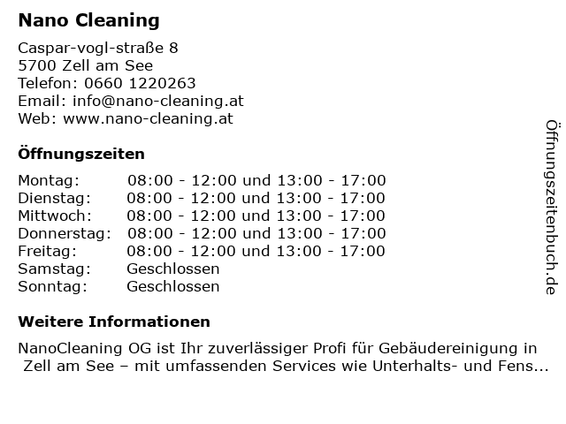 | Öffnungszeiten Nano Cleaning in Zell am See anzeigen | |