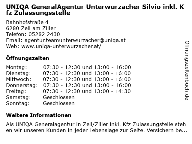 1 UNIQA GeneralAgentur Unterwurzacher Silvio inkl. Kfz Zulassungsstelle (Entfernung: 0,00 km) Bahnhofstraße 4, 6280 Zell am Ziller 2 UNIQA Versicherungen AG - Berater Silvio Unterwurzacher (Büro | Service | KFZ-Zulassung) (Entfernung: 0,00 km) Bahnhofstraße 4, 6280 Zell/Ziller 3 UNIQA Versicherungen AG - Berater Wilfried Eberl (Büro | Service | KFZ-Zulassung) (Entfernung: 0,00 km) Bahnhofstraße 4, 6280 Zell/Ziller 5 UNIQA GeneralAgentur Emberger und Huber GbR & Kfz Zulassungsstelle (Entfernung: 15,18 km) Gewerbeweg 6, 6263 Fügen 6 Uniqa Versicherungen - GeneralAgentur Geisler und Mitges. GESNBR (Beratung & Service) (Entfernung: 15,18 km) Gewerbeweg 6, 6263 Fügen |