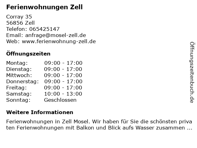 | Öffnungszeiten Ferienwohnungen Zell in Zell anzeigen | |