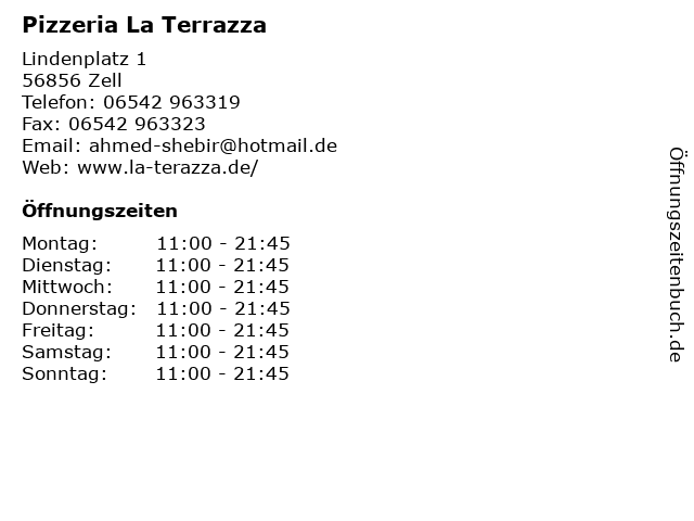 | Öffnungszeiten Pizzeria La Terrazza in Zell anzeigen | |