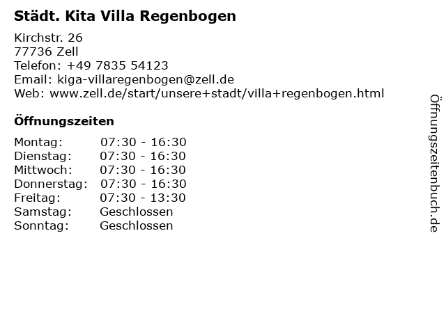 | Öffnungszeiten Städt. Kita Villa Regenbogen in Zell anzeigen | |