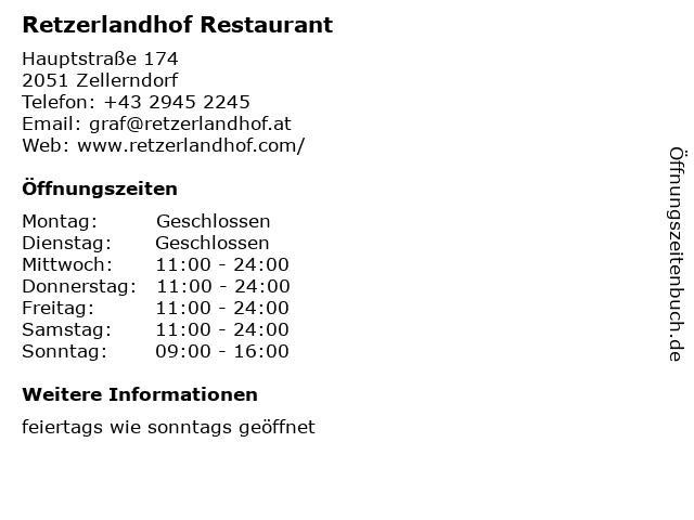 | Öffnungszeiten Retzerlandhof Restaurant in Zellerndorf anzeigen | |