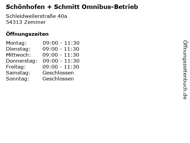 | Öffnungszeiten Schönhofen + Schmitt Omnibus-Betrieb in Zemmer anzeigen | |