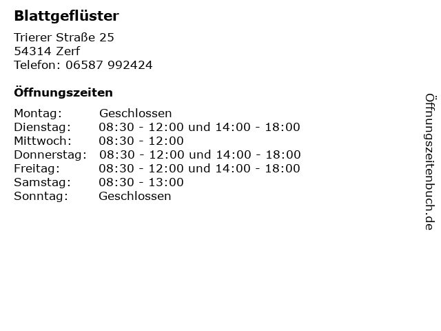 | Öffnungszeiten Blattgeflüster in Zerf anzeigen | |