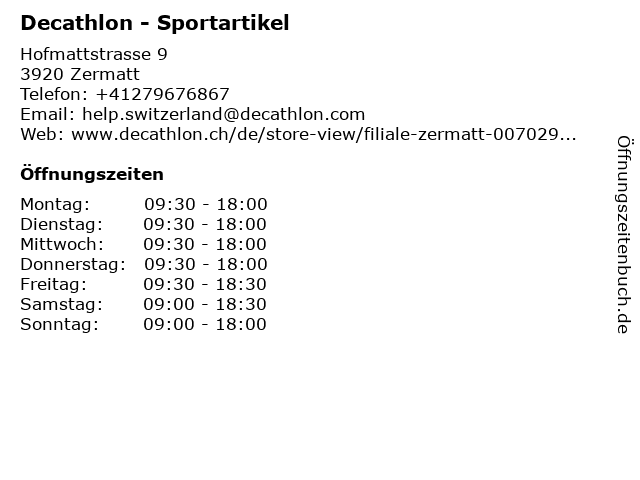 | Öffnungszeiten Decathlon - Sportartikel in Zermatt anzeigen | |
