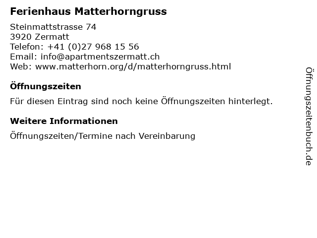 | Öffnungszeiten Ferienhaus Matterhorngruss in Zermatt anzeigen | |