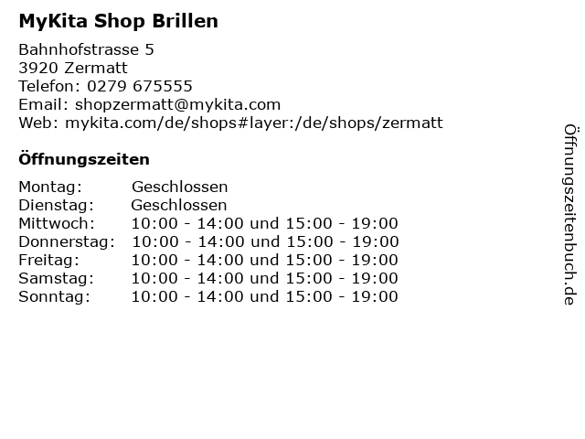 | Öffnungszeiten MyKita Shop Brillen in Zermatt anzeigen | |