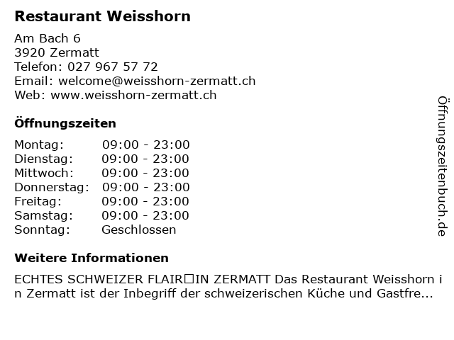 | Öffnungszeiten Restaurant Weisshorn in Zermatt anzeigen | |
