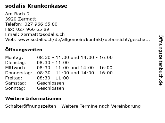 | Öffnungszeiten sodalis Krankenkasse in Zermatt anzeigen | |