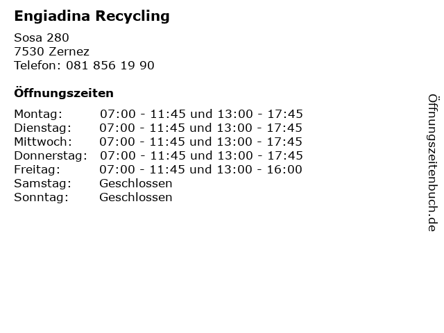| Öffnungszeiten Engiadina Recycling in Zernez anzeigen | |
