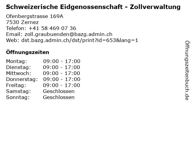 3 Die Schweizerische Post AG - Filiale La Punt-Chamues-ch (Entfernung: 19,20 km) Via Cumünela 19, 7522 La Punt-Chamues 4 Schweizerische Eidgenossenschaft - Zollverwaltung (Entfernung: 34,42 km) Hauptstrasse 243, 7560 Martina 6 |