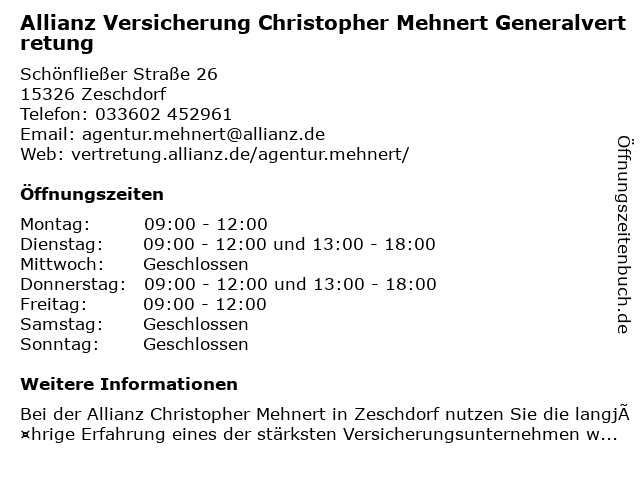 1 Allianz Versicherung Marco Müller Generalvertretung (Entfernung: 5,92 km) Gewerbepark-kirschallee 20 c, 15326 Lebus 4 Allianz Versicherung Marco Müller Generalvertretung (Entfernung: 10,68 km) Bergstraße 185, 15230 Frankfurt (Oder) 5 Allianz Versicherung-Marco Müller Generalvertretung (Entfernung: 10,69 km) Bergstr. 185, 15230 Frankfurt 6 Allianz Versicherung Tobias Schubert Generalvertretung (Entfernung: 11,21 km) Fürstenwalder Straße 19, 15234 Frankfurt (Oder) |
