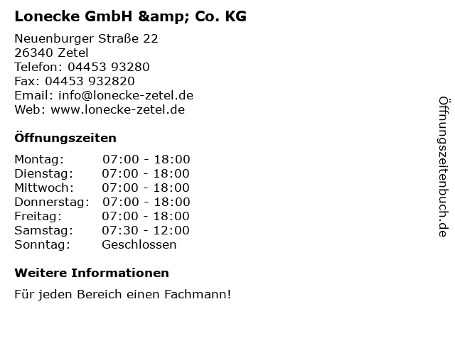 | Öffnungszeiten Lonecke GmbH & Co. KG in Zetel anzeigen | |
