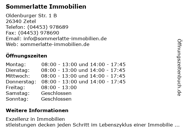 | Öffnungszeiten Sommerlatte Immobilien in Zetel anzeigen | |