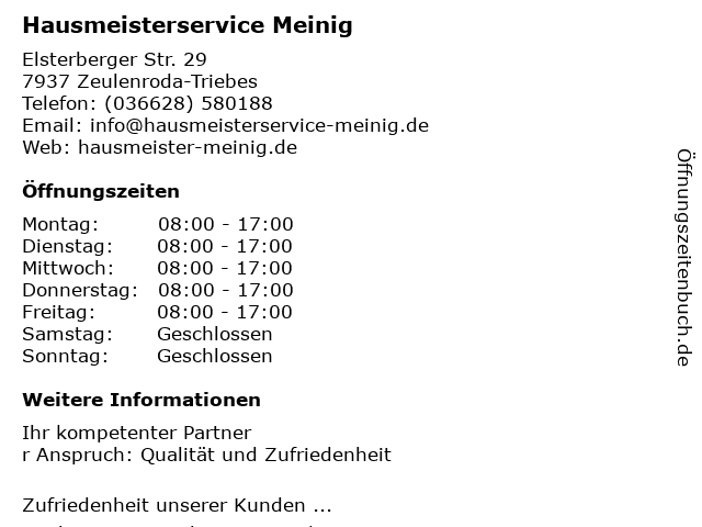2 Hausmeisterservice Joachim Lautenschläger (Entfernung: 0,89 km) Schleizer Str. 60, 07937 Zeulenroda-Triebes 3 Jörg Fleischer Landschaftspflege u. Hausmeisterservice (Entfernung: 8,31 km) Hauptstr. 119, 07957 Langenwetzendorf 6 |