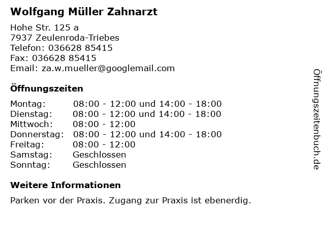 2 Wolfram Krause Zahnarzt f.Kieferorthopädie (Entfernung: 0,48 km) Greizer Str. 68 -70, 07937 Zeulenroda-Triebes 5 Wolfgang Fröbisch Forst- u. Dienstleistungsservice (Entfernung: 4,73 km) Zum Lerchenberg 5, 07937 Zeulenroda-Triebes 6 |