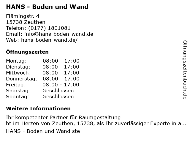 | Öffnungszeiten HANS - Boden und Wand in Zeuthen anzeigen | |