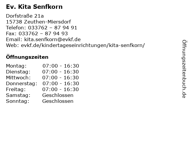 | Öffnungszeiten Ev. Kita Senfkorn in Zeuthen-Miersdorf anzeigen | |