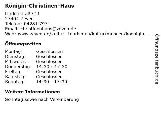 | Öffnungszeiten Königin-Christinen-Haus in Zeven anzeigen | |