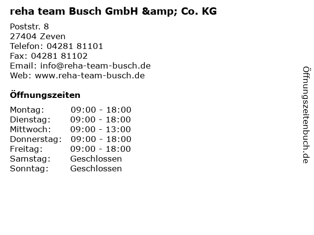 | Öffnungszeiten reha team Busch GmbH & Co. KG in Zeven anzeigen | |